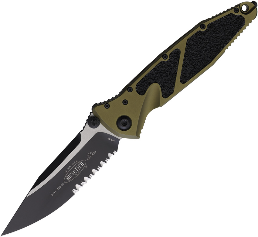 5.13″ (13.03cm) closed. 4″ (10.16cm) two-tone finish partially serrated premium steel blade. OD green aluminum handle with black traction insert. Thumb stud. Lanyard hole. Glass breaker. Pocket clip. Boxed.
