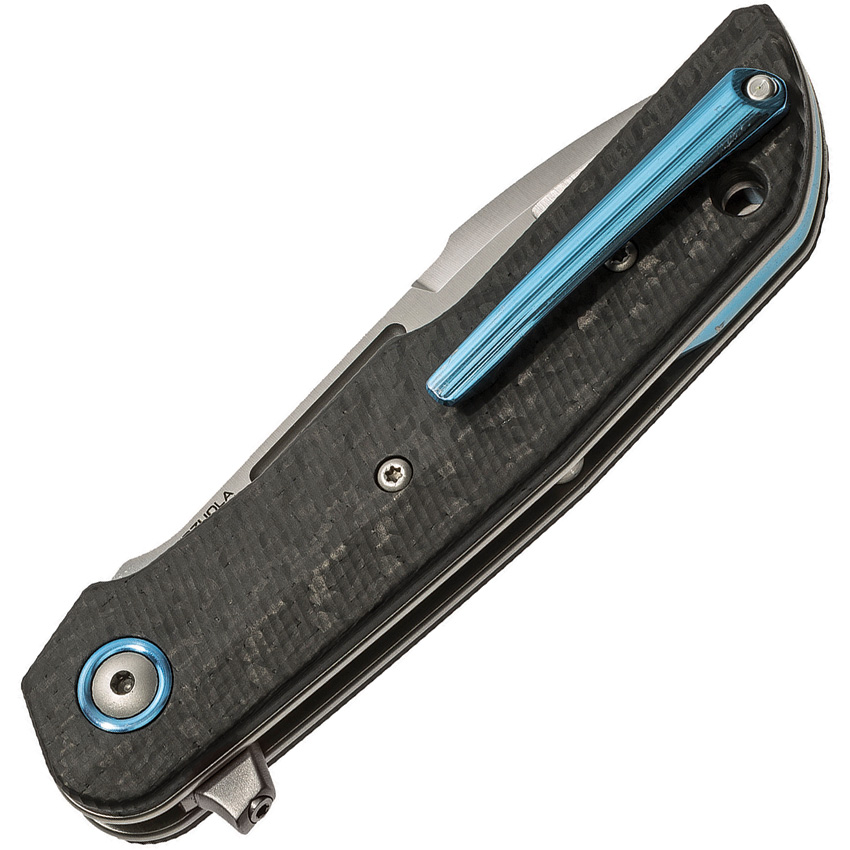 Clap Linerlock. 4″ closed. 3″ satin finish Bohler M390 stainless drop point blade. Carbon fiber handle. Extended tang. Lanyard hole. Pocket clip. Compound grind blade. Made in Italy by LionSTEEL. Black nylon zippered storage case. Designed by Bob Terzuola. Boxed.