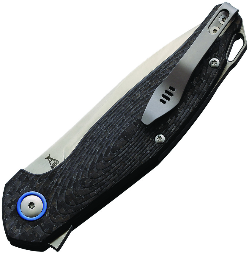 4.5″ (11.43cm) closed. 3.5″ (8.89cm) satin finish Bohler M390 stainless blade. Carbon fiber handle. Extended tang. Lanyard hole. Titanium sand blast finish spacer and pocket clip. Black ballistic nylon zippered storage case. Designed by Jens Anso. Boxed.