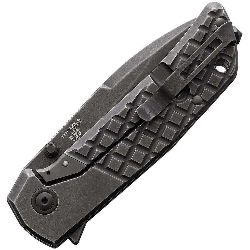 4.5″ (11.43cm) closed. 3.5″ (8.89cm) black stonewash finish Bohler M390 stainless blade. Black stonewash finish titanium handle. Extended tang. Lanyard hole. Pocket clip. Thumb stud. Black nylon zippered storage case. Boxed.