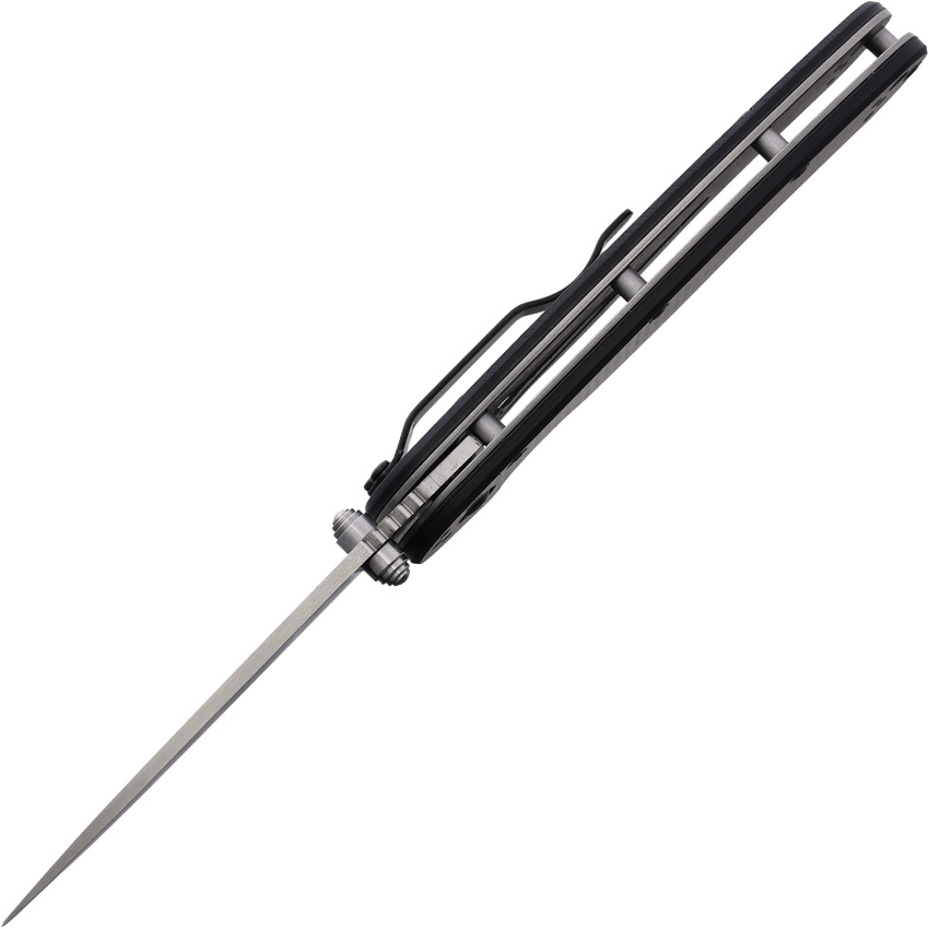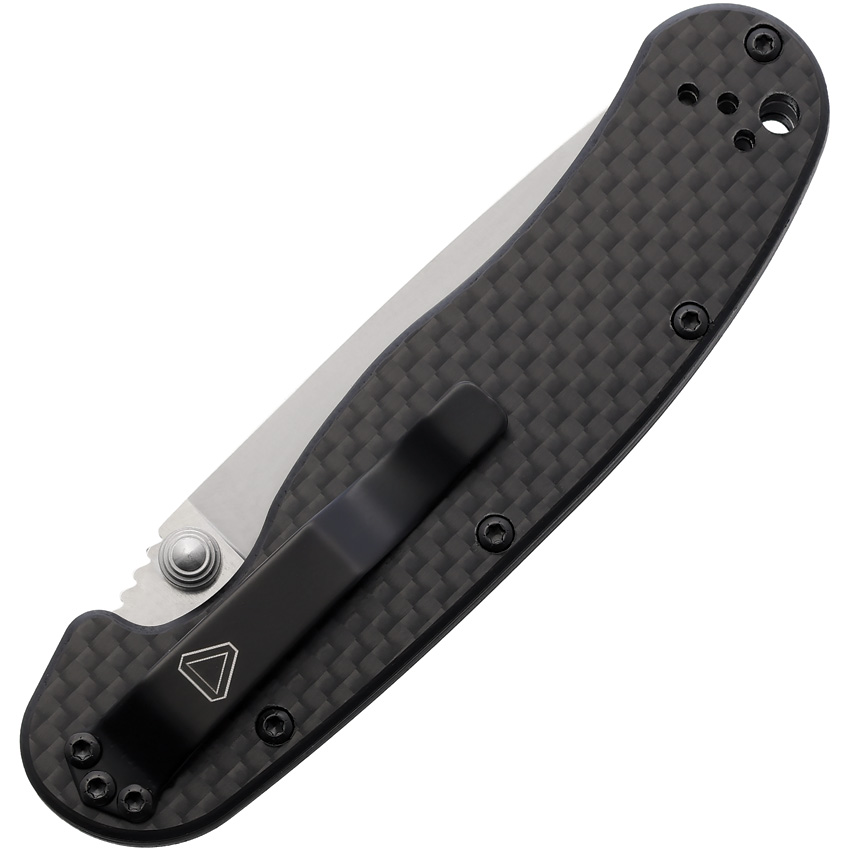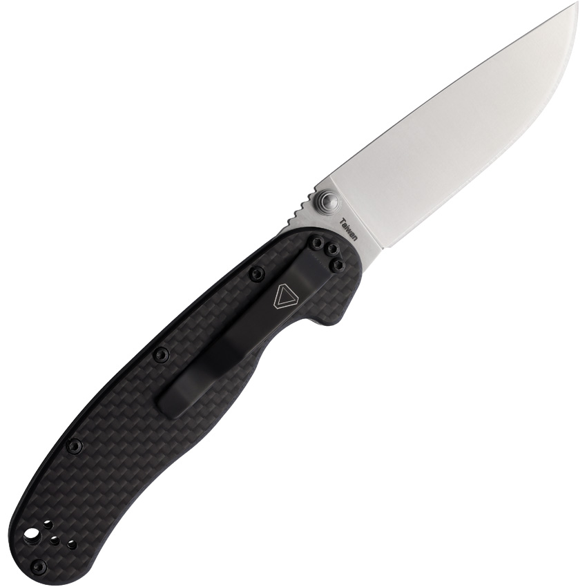 4″ closed. 3″ satin finish D2 tool steel drop point blade. Carbon fiber handle. Thumb stud. Pocket clip. Lanyard hole. Boxed.