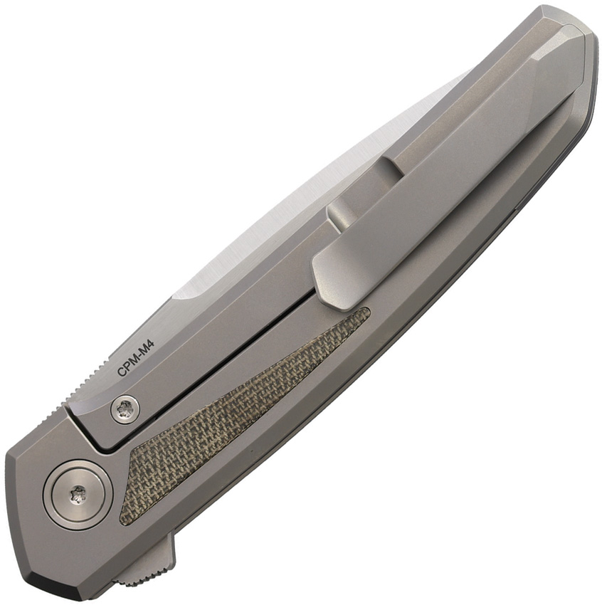 4.38″ (11.13cm) closed. 3.38″ (8.59cm) satin finish flat ground CPM-M4 stainless drop point blade. Gray titanium handle with Green and brown micarta inlay. Pocket clip. Extended tang. Boxed.