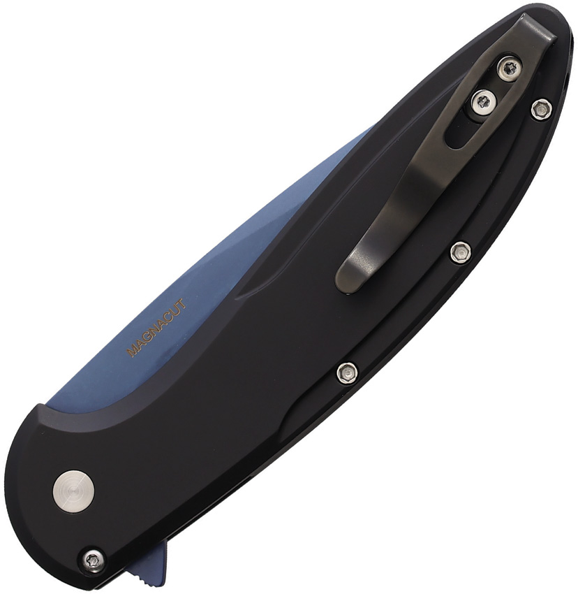 4.5″ (11.43cm) closed. 3.5″ (8.89cm) blue coated MagnaCut steel blade. Black anodized aluminum handle with Shredded carbon fiber inlay. Extended tang. Pocket clip. Mosaic button. Boxed.