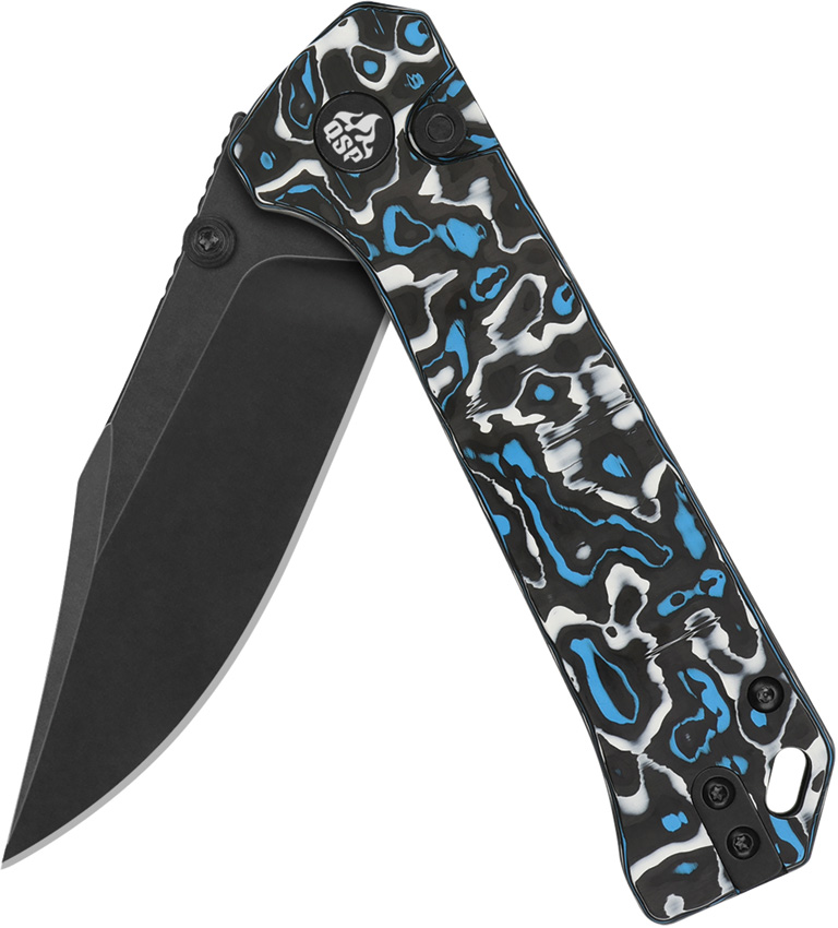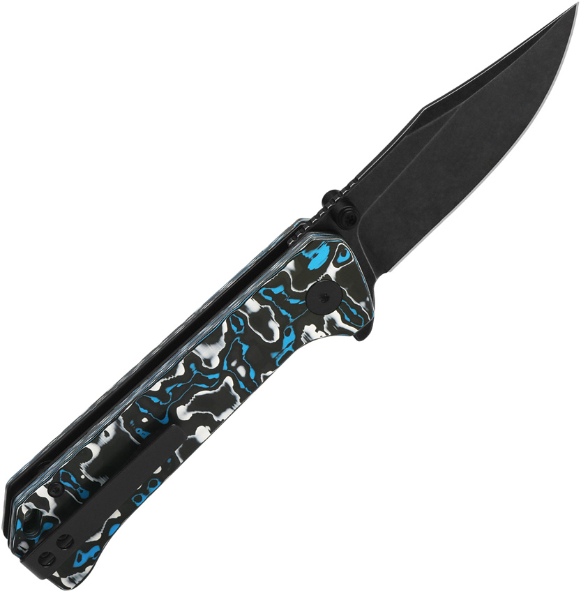4.25″ (10.8cm) closed. 3″ (7.62cm) black stonewash finish S35VN stainless clip point blade. Black, white, and blue carbon fiber handle. Extended tang. Lanyard hole. Pocket clip. Thumb stud. Boxed.