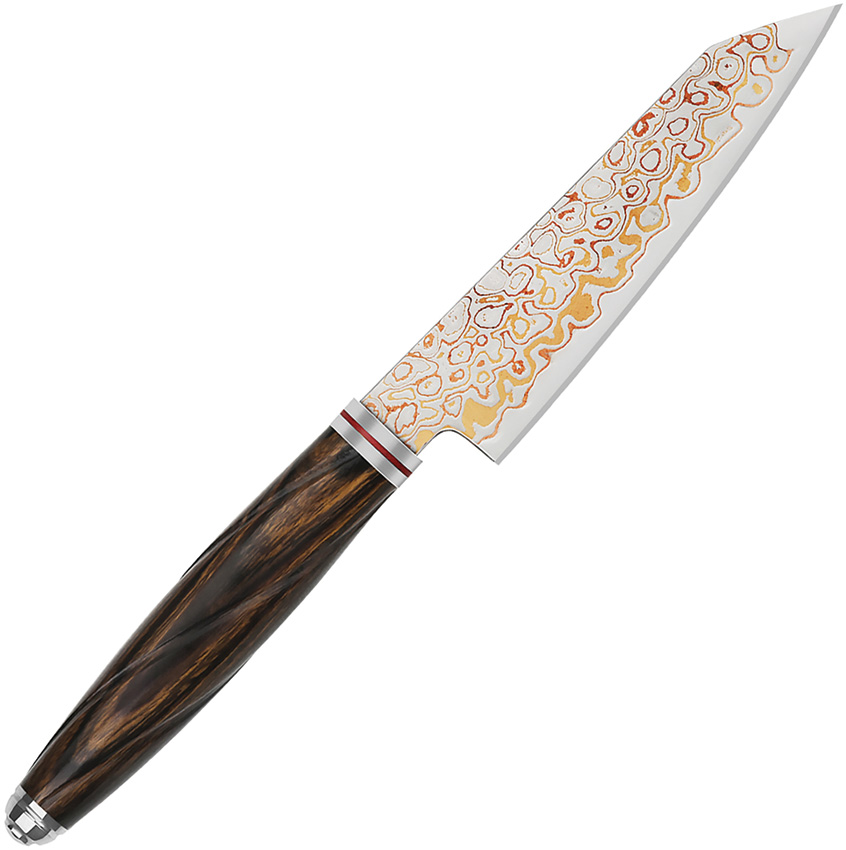 8.38″ (21.29cm) overall. 4″ (10.16cm) Damascus steel blade. Ironwood handle. Brass and copper blade. Brown leather belt sheath. Boxed.