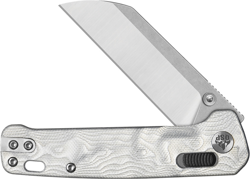 4″ (10.16cm) closed. 3″ (7.62cm) stonewash and satin finish 14C28N Sandvik stainless sheepsfoot blade. Aluminum foil G10 handle. Thumb stud. Lanyard hole. Pocket clip. Boxed.
