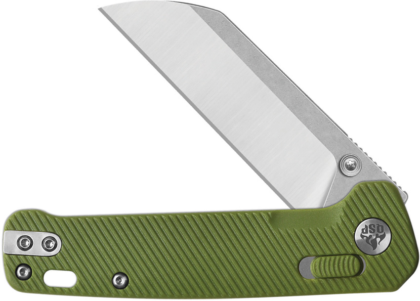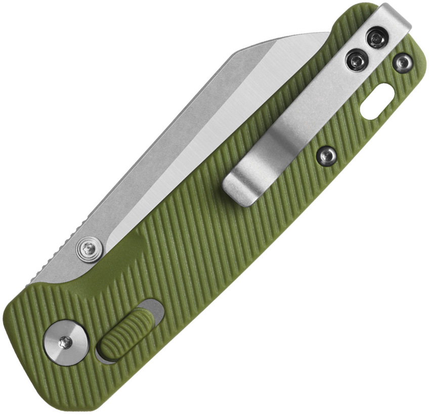 4″ (10.16cm) closed. 3″ (7.62cm) stonewash and satin finish 14C28N Sandvik stainless sheepsfoot blade. OD green FRN handle. Thumb stud. Lanyard hole. Pocket clip. Boxed.