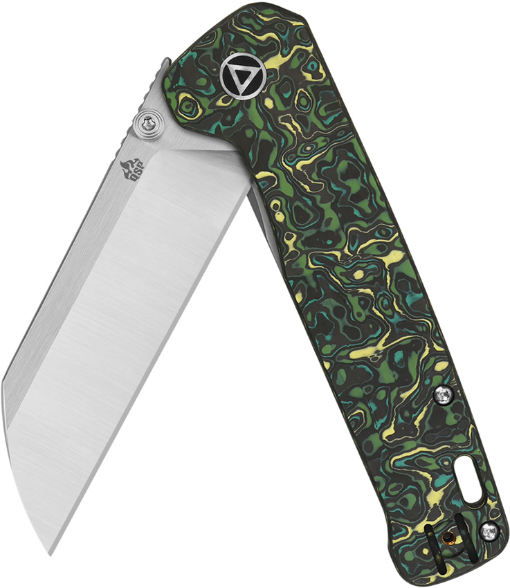 4.5″ (11.43cm) closed. 3.38″ (8.59cm) satin finish CPM-20CV stainless blade. Green, black, and yellow carbon fiber handle with bead blast finish titanium back handle. Extended tang. Lanyard hole. Pocket clip. Thumb stud. Boxed.
