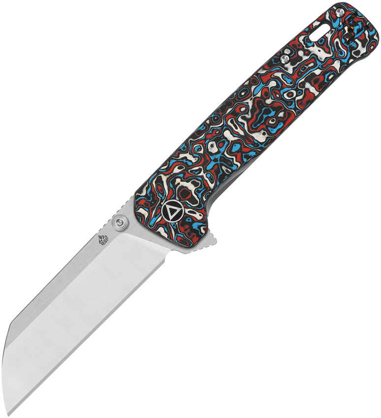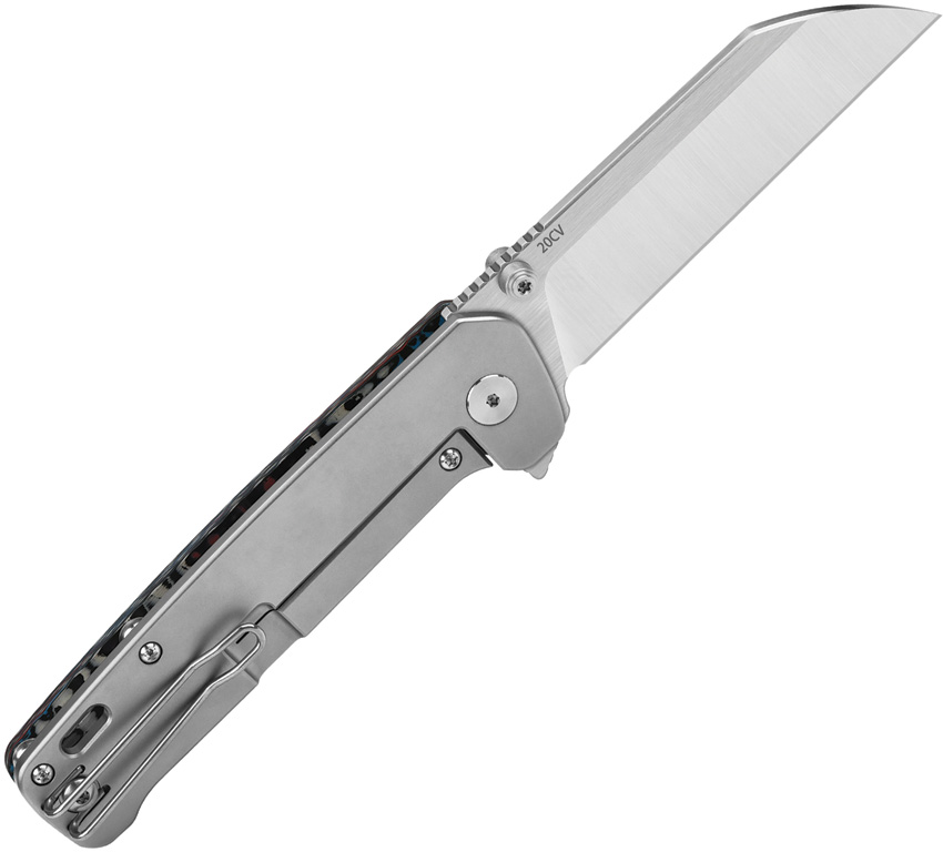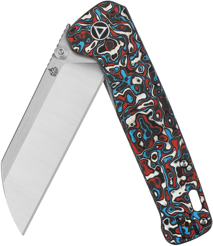4.5″ (11.43cm) closed. 3.38″ (8.59cm) satin finish CPM-20CV stainless blade. Red, white, and blue carbon fiber handle with bead blast finish titanium back handle. Thumb stud. Lanyard hole. Pocket clip. Extended tang. Boxed.