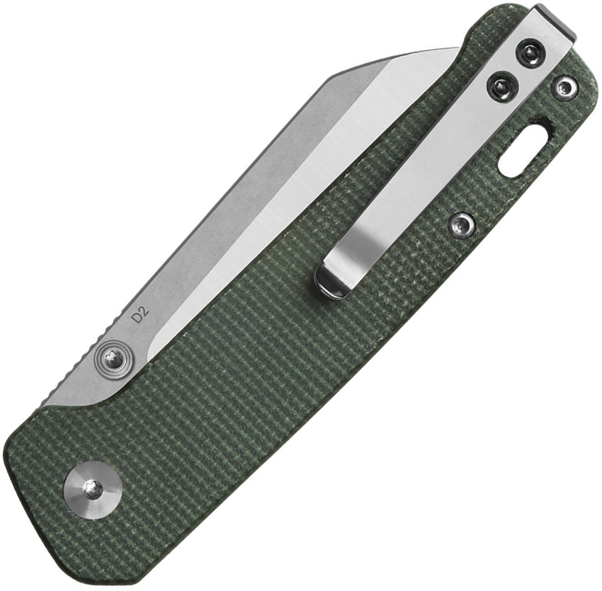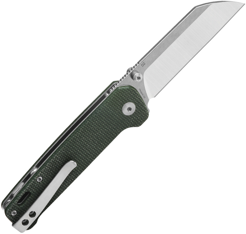 4″ (10.16cm) closed. 3″ (7.62cm) stonewash and satin finish D2 tool steel sheepsfoot blade. Green micarta handle. Thumb stud. Lanyard hole. Pocket clip. Boxed.