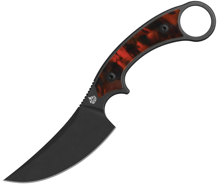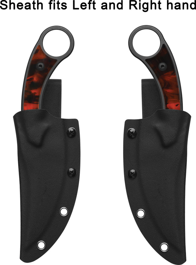 8.5″ (21.59cm) overall. 4.00″ (10.16cm) black stonewash finish 10Cr15CoMoV stainless clip point blade. Black and red tortoise resin handle. Full, extended tang. Finger ring. Sheath fits left and right hand. Black Kydex belt sheath. Boxed.