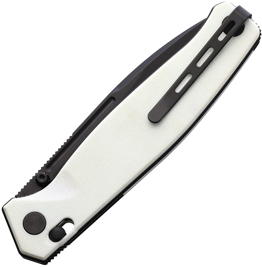 4.63″ (11.76cm) closed. 3.63″ (9.22cm) black oxide coated VG-10 stainless blade. White G10 handle. Thumb stud. Pocket clip. Boxed.