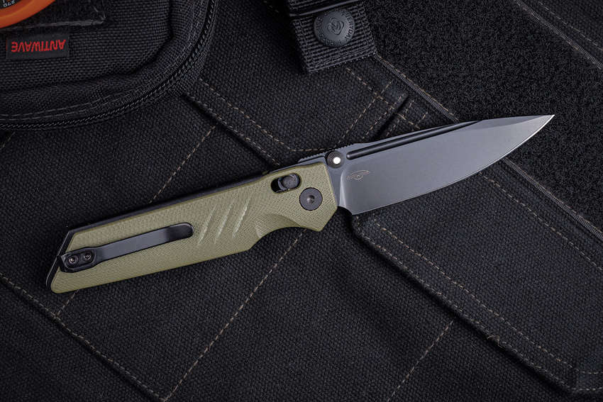 4.13″ (10.49cm) closed. 3.25″ (8.26cm) black PVD coated Bohler K110 stainless blade. OD green G10 handle. Pocket clip. Thumb stud. Boxed.