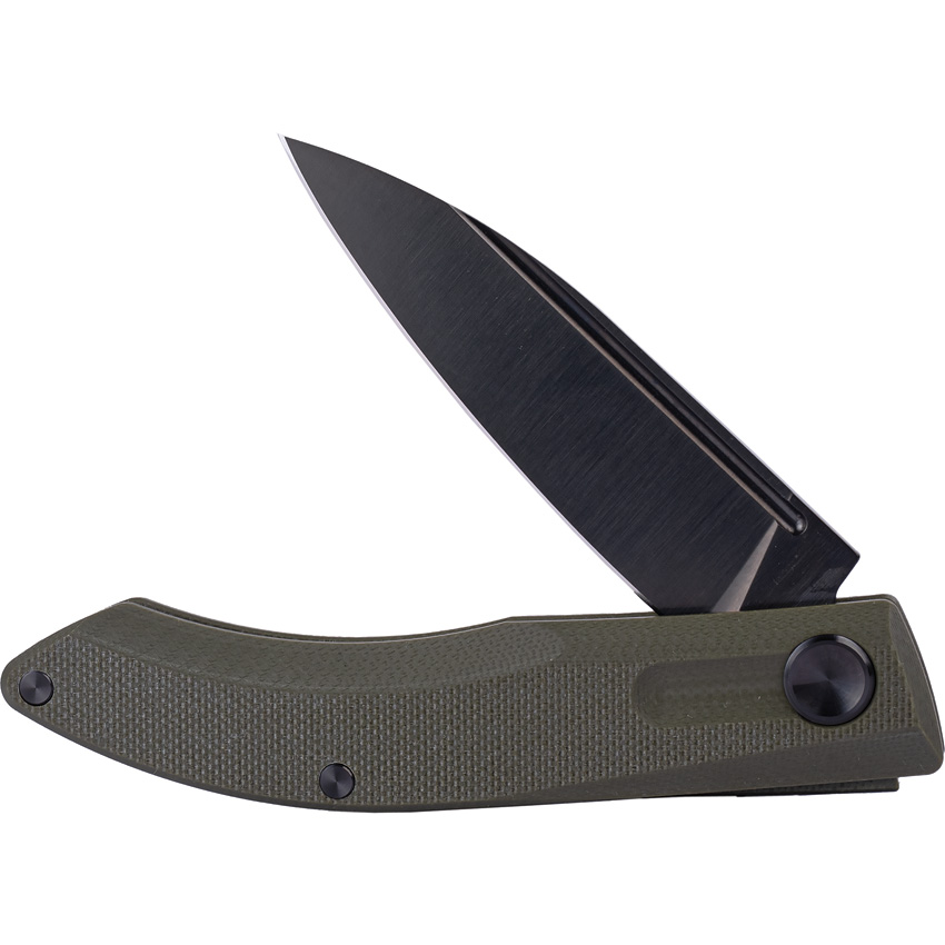 4″ (10.16cm) closed. 3″ (7.62cm) black DLC coated K110 tool steel blade. OD green G10 handle. Pocket clip. Slip joint. Boxed.