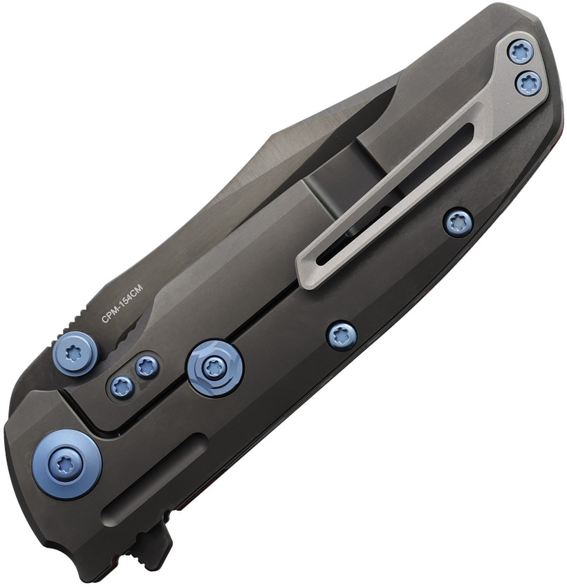 4.63″ (11.76cm) closed. 3.5″ (8.89cm) black DLC coated CPM-154 stainless clip point blade. Lava Flow Fat carbon fiber handle with black titanium back handle. Extended tang. Thumb stud. Pocket clip. Boxed.