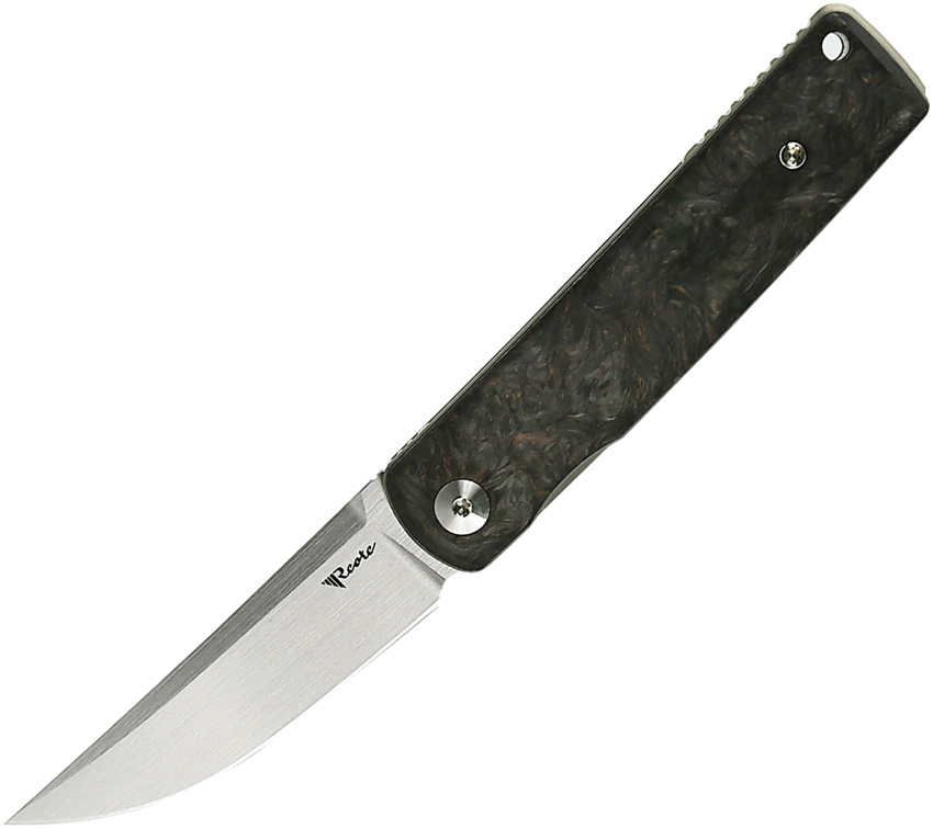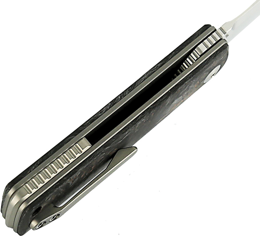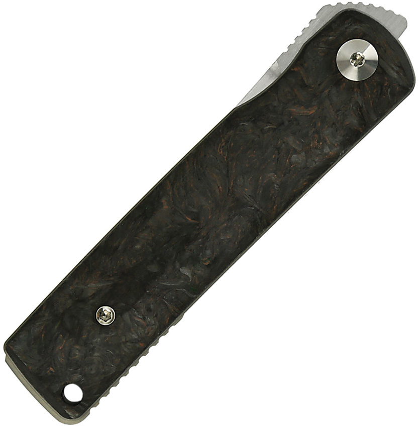 3.88″ (9.86cm) closed. 2.75″ (6.99cm) satin finish Bohler M390 stainless blade. Dark matter copper carbon fiber handle. Pocket clip. Lanyard hole. Boxed.