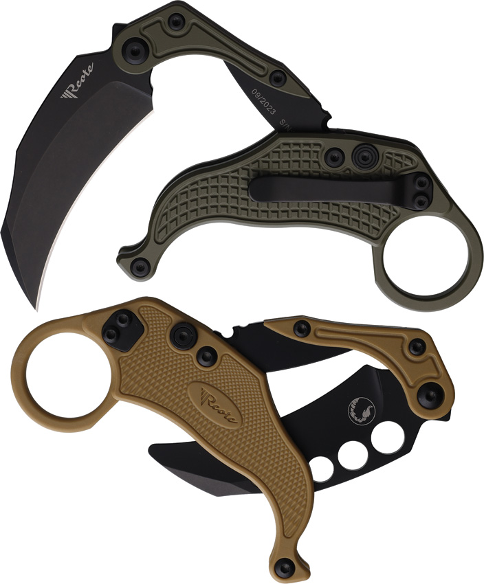 4.5″ (11.43cm) closed. 3.13″ (7.95cm) black coated Bohler N690 stainless hawkbill blade. Green textured aluminum handle. Finger ring. Pocket clip. Pivoting frame and reverse-positioned button lock that allow blade deployment with gravity. Includes trainer with tan handle and unsharpened blade. Boxed.