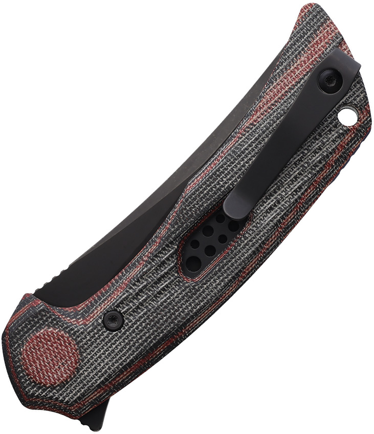 4.5″ (11.43cm) closed. 3.5″ (8.89cm) black PVD coated Nitro V steel curved blade. Black and red canvas micarta handle. Extended tang. Lanyard hole. Pocket clip. Boxed.