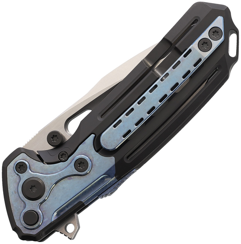 5.25″ (13.34cm) closed. 4″ (10.16cm) stonewash and satin finish MagnaCut steel blade. Black DLC coated titanium handle with Crystallized blue titanium onlay. Extended tang. Pocket clip. Thumb stud. Serialized. Boxed.