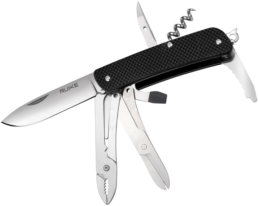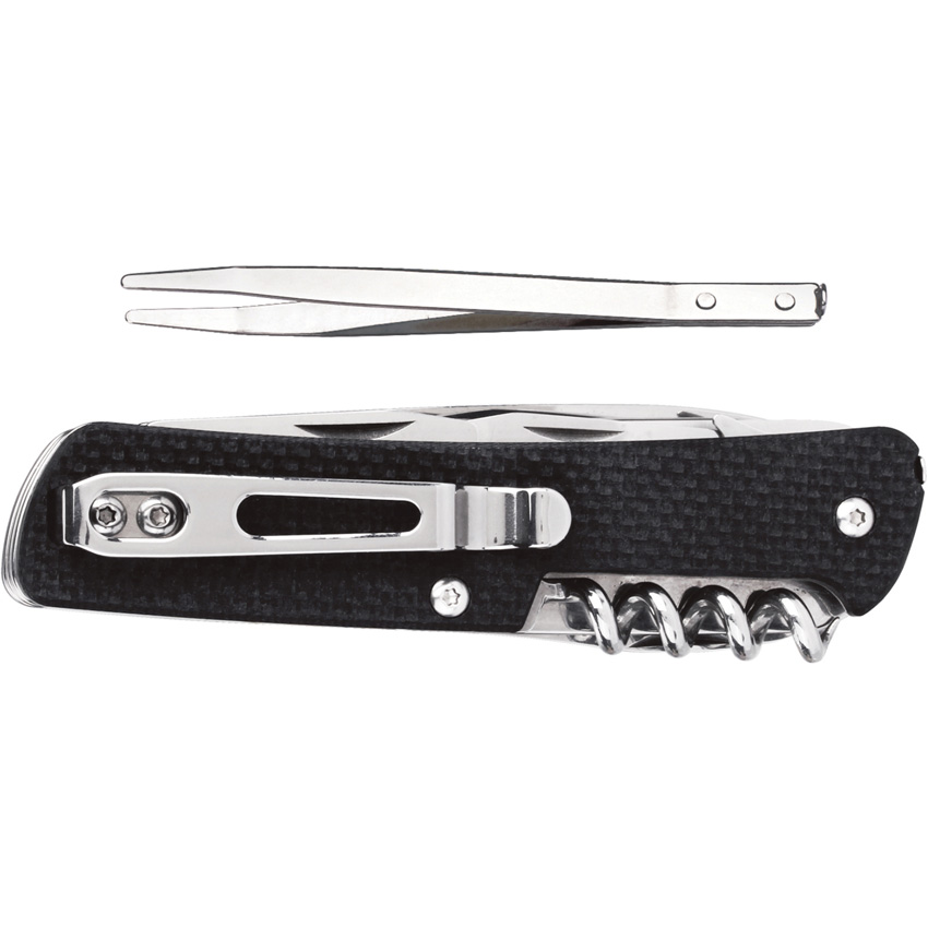 3.75″ (9.53cm) closed. 12C27 Sandvik stainless blade. Black G10 handle. Tools include: Large blade l Pocket clip l Glass breaker l Tweezers l Corkscrew l Bottle opener l Belt/cord cutter l Large screwdriver l Wire stripper l Small screwdriver l Keyring l Pliers l Reamer with sewing eye l Scissors l Wire cutter I Drill I Facer I Fishing line pliers. Boxed.