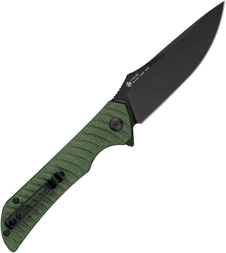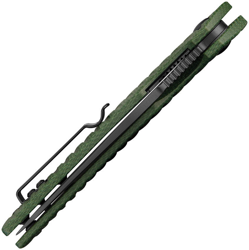 4.75″ (12.07cm) closed. 3.75″ (9.53cm) black stonewash finish 14C28N Sandvik stainless blade. Green sculpted micarta handle. Extended tang. Pocket clip. Boxed.