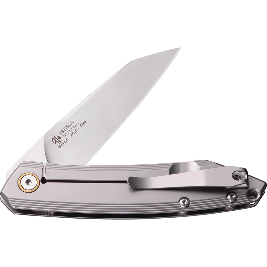 4.25″ (10.8cm) closed. 3.25″ (8.26cm) satin finish 14C28N Sandvik stainless blade. Gray stainless handle. Extended tang. Lanyard hole. Pocket clip. Boxed.