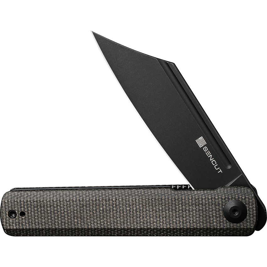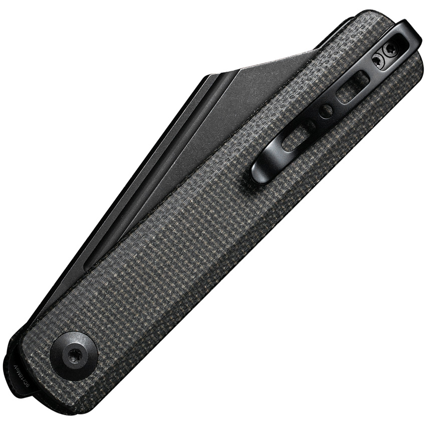 4.5″ (11.43cm) closed. 3.38″ (8.59cm) black stonewash finish 9Cr18MoV stainless blade. Dark green canvas micarta handle. Pocket clip. Black nylon zippered storage case. Boxed.