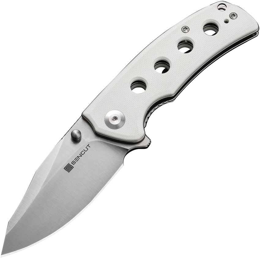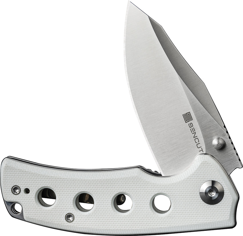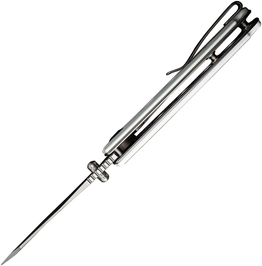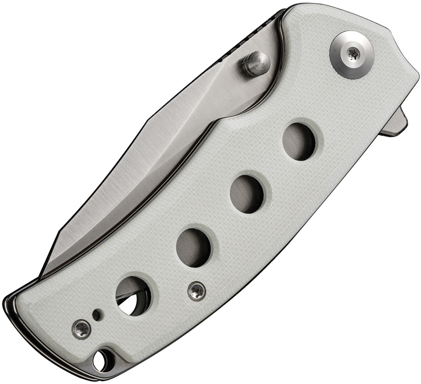 4″ (10.16cm) closed. 3″ (7.62cm) satin finish 9Cr18MoV stainless blade. White G10 handle. Thumb stud. Extended tang. Lanyard hole. Pocket clip. Reverse tanto blade. Black nylon zippered storage case. Boxed.