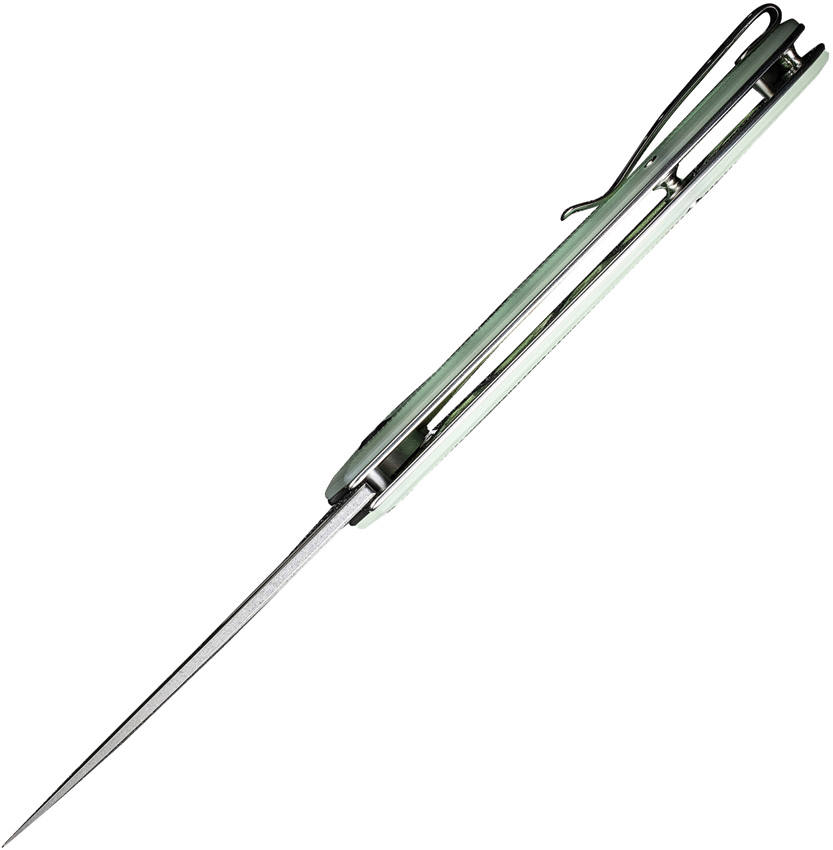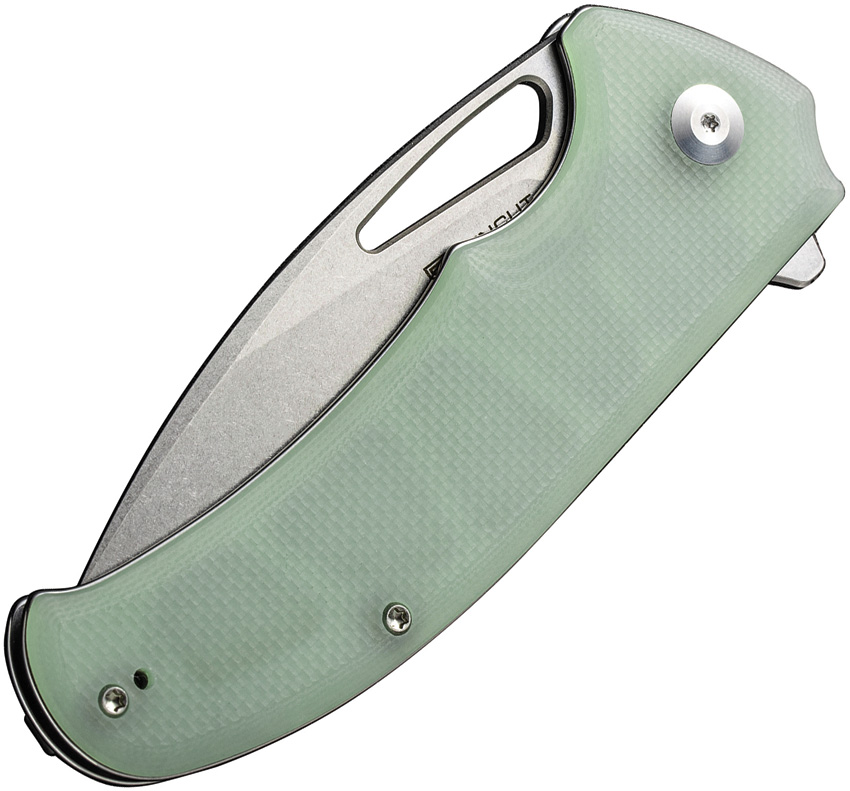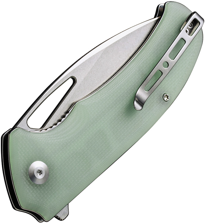 5″ (12.7cm) closed. 3.75″ (9.53cm) stonewash finish 9Cr18MoV stainless drop point blade. Jade G10 handle. Extended tang. Thumb pull. Pocket clip. Black nylon zippered storage case. Boxed.