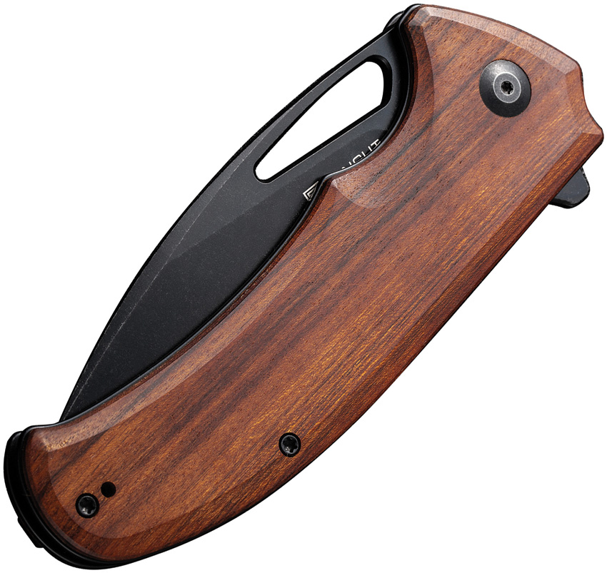 5″ (12.7cm) closed. 3.75″ (9.53cm) black stonewash finish 9Cr18MoV stainless drop point blade. Brown wood handle. Thumb pull. Extended tang. Pocket clip. Black nylon zippered storage case. Boxed.