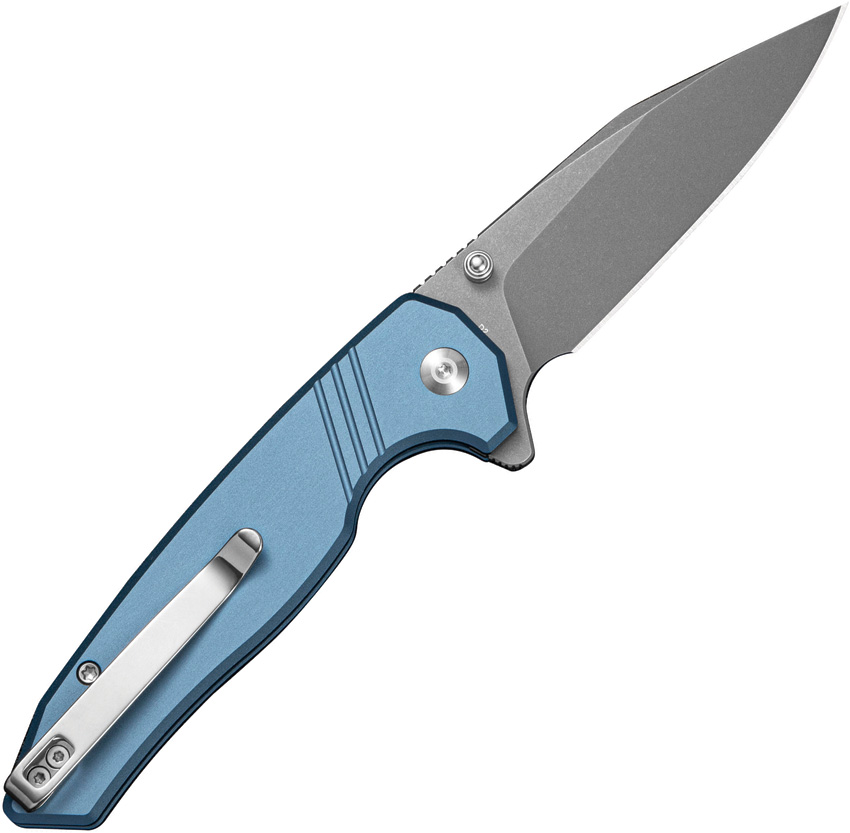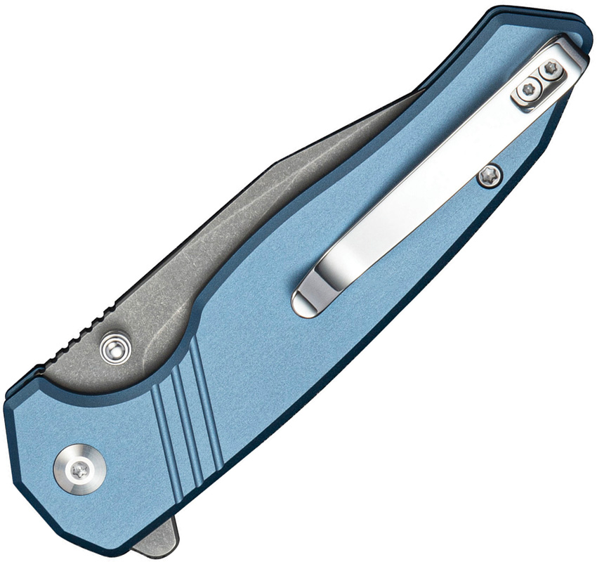 4.38″ (11.13cm) closed. 3.38″ (8.59cm) gray coated D2 tool steel clip point blade. Blue anodized aluminum handle. Thumb stud. Extended tang. Pocket clip. Boxed.