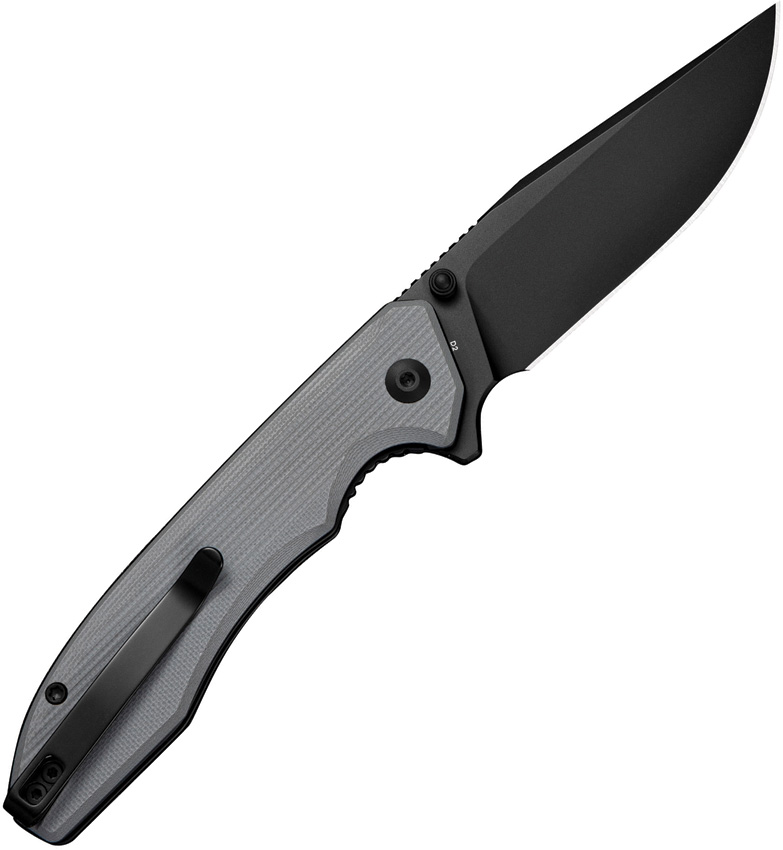 4.63″ (11.76cm) closed. 3.38″ (8.59cm) black finish D2 tool steel clip point blade. Gray G10 handle. Extended tang. Thumb stud. Pocket clip. Black nylon zippered storage case. Boxed.