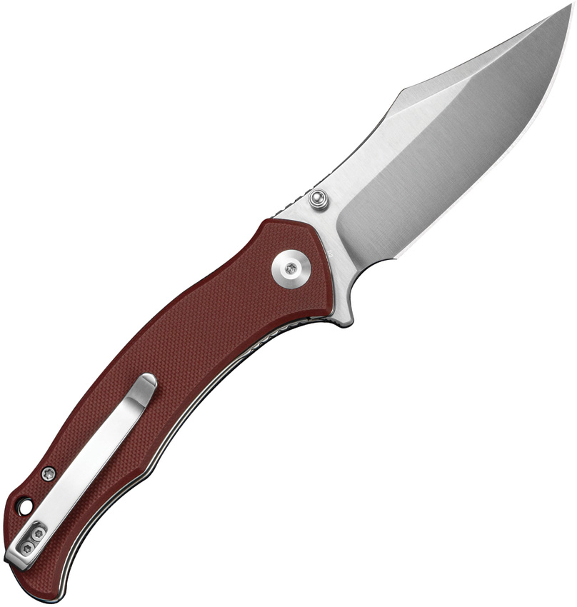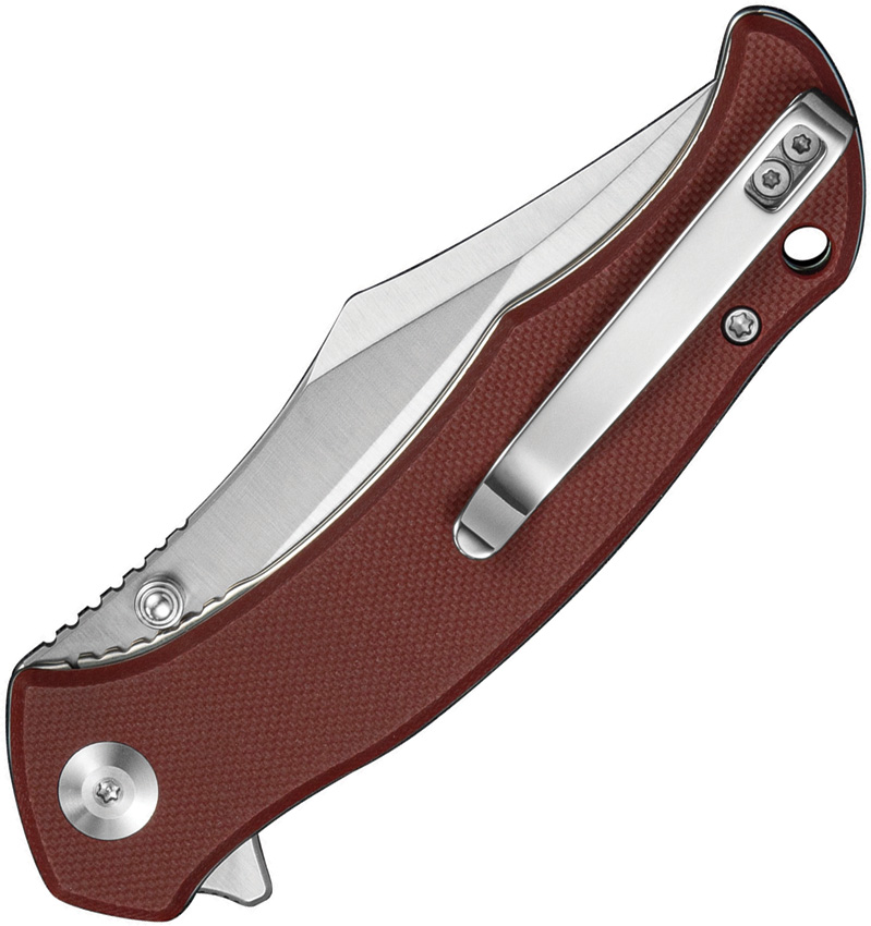 4.5″ (11.43cm) closed. 3.5″ (8.89cm) satin finish D2 tool steel clip point blade. Burgundy G10 handle. Extended tang. Thumb stud. Lanyard hole. Pocket clip. Black nylon zippered storage case. Boxed.