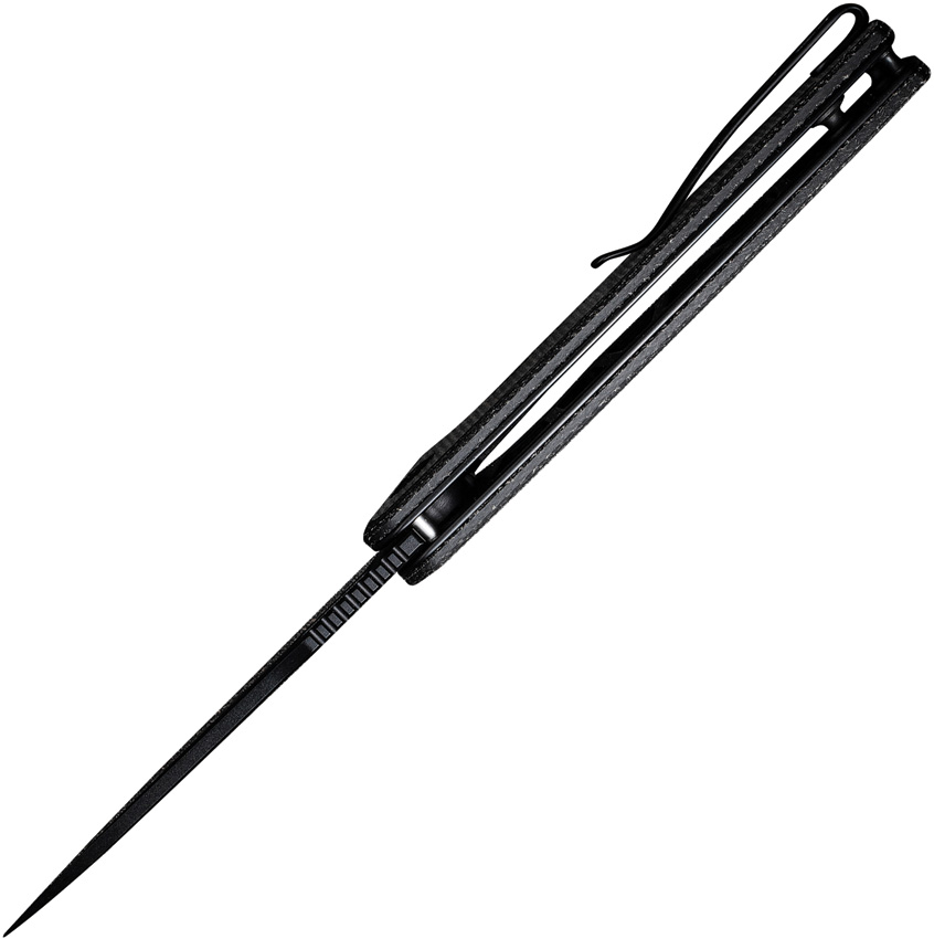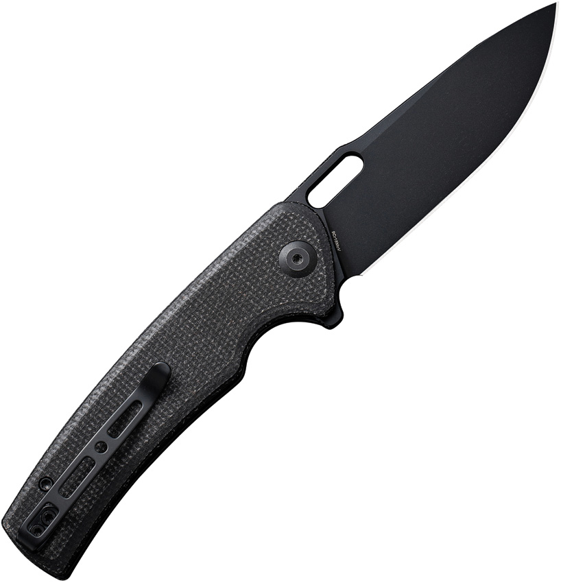 4.5″ (11.43cm) closed. 3.38″ (8.59cm) black finish 9Cr18MoV stainless blade. Black canvas micarta handle. Extended tang. Thumb pull. Pocket clip. Boxed.
