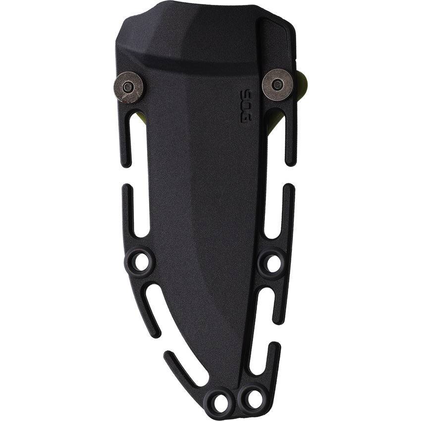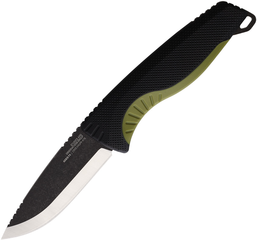 8.88″ (22.56cm) overall. 3.75″ (9.53cm) stonewash and satin finish 4116 stainless drop point blade. Black and green rubberized GRN handle. Lanyard hole. Full, extended tang. Black nylon MOLLE compatible belt sheath. Boxed.