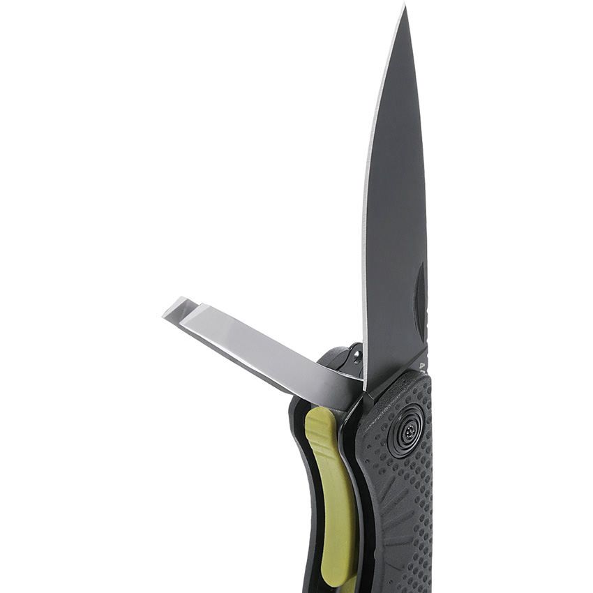 GRN handles. Tools include: Needlenose pliers l Wire cutter l Small blade l Tweezers l Bottle opener. 4.5″ open. 3.2″ closed. 440 stainless tools. Color: Black and moss. Clam packed.