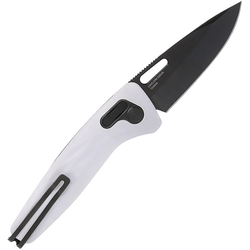 4.75″ (12.07cm) closed. 3.13″ (7.95cm) black TiNi coated CPM S35VN stainless clip point blade. White aluminum handle. Thumb pull. Pocket clip. Boxed.