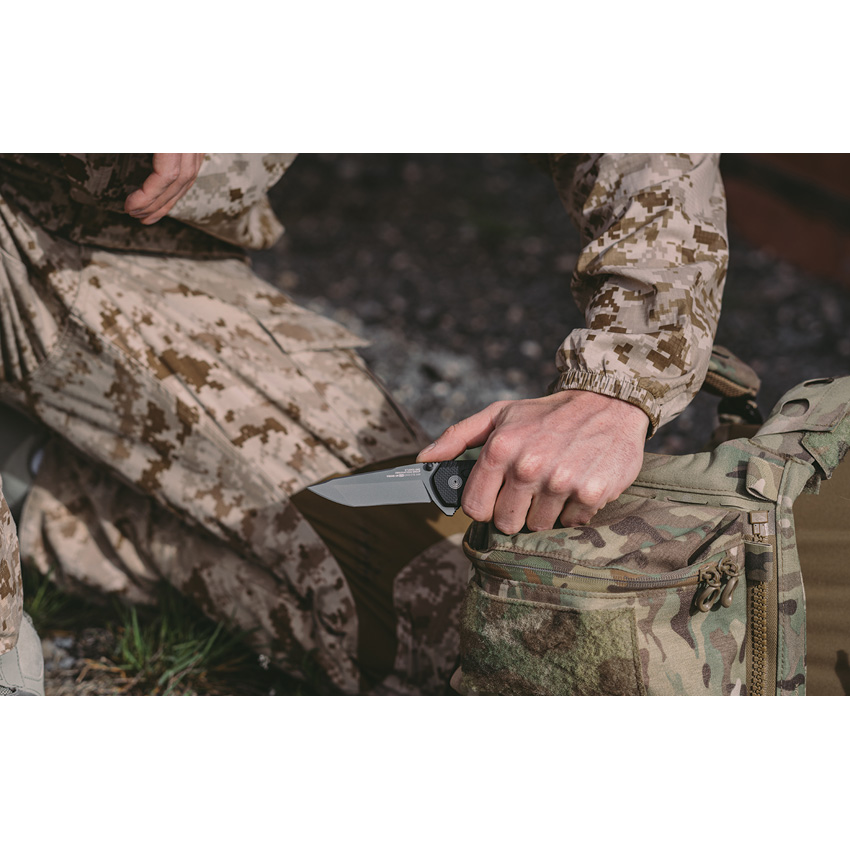 4.63″ (11.76cm) closed. 3.38″ (8.59cm) gray TiNi coated CTS-XHP stainless tanto blade. Black G10 handle. Extended tang. Thumb stud. Pocket clip. Boxed.
