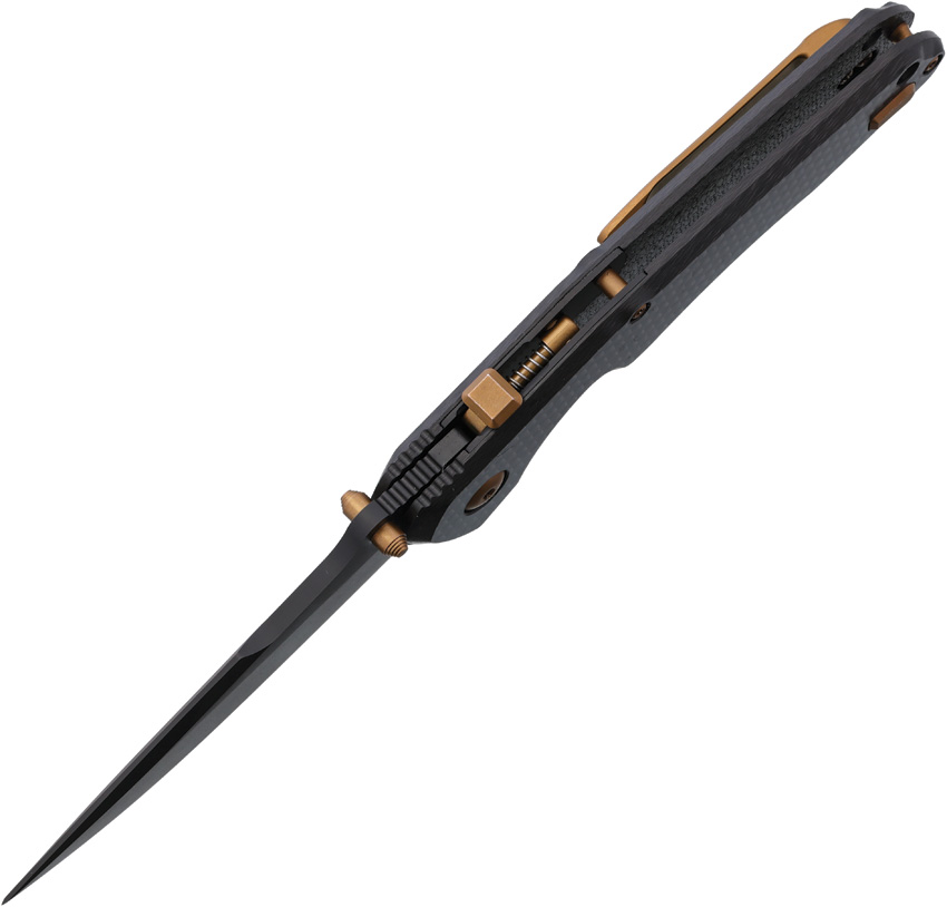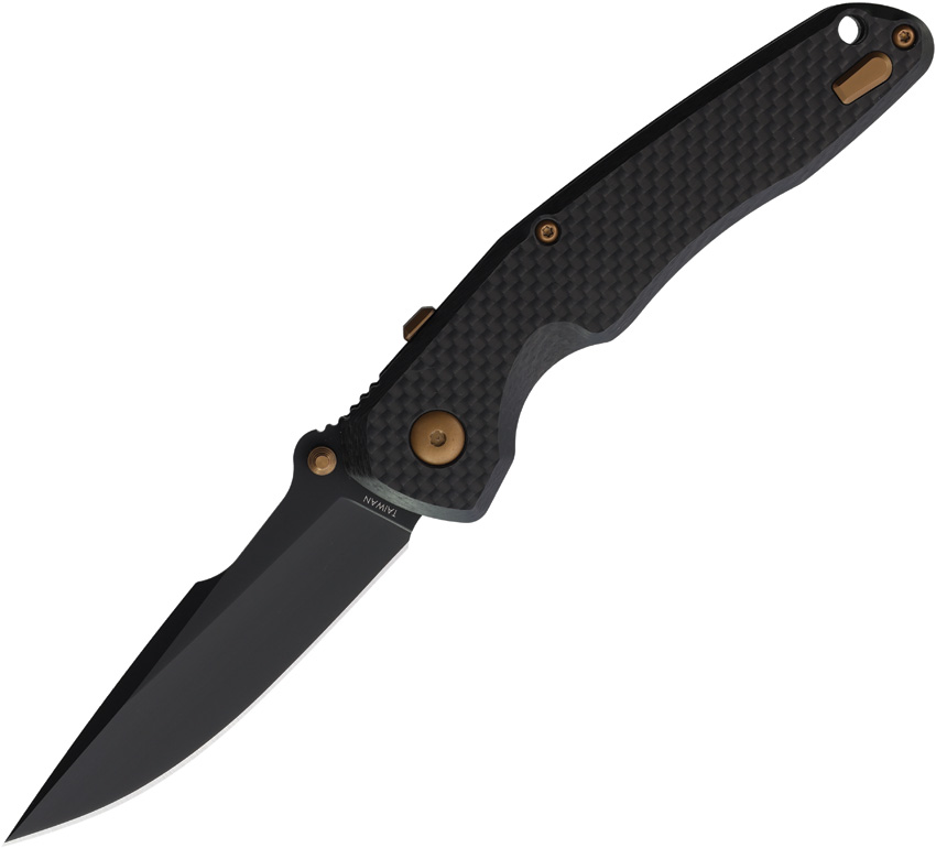 4.25″ (10.8cm) closed. 3.25″ (8.26cm) black PVD coated flat ground S35VN stainless spear point blade. Thumb stud. Lanyard hole. Pocket clip. Black G10 and carbon fiber handle with bronze accents. Boxed.