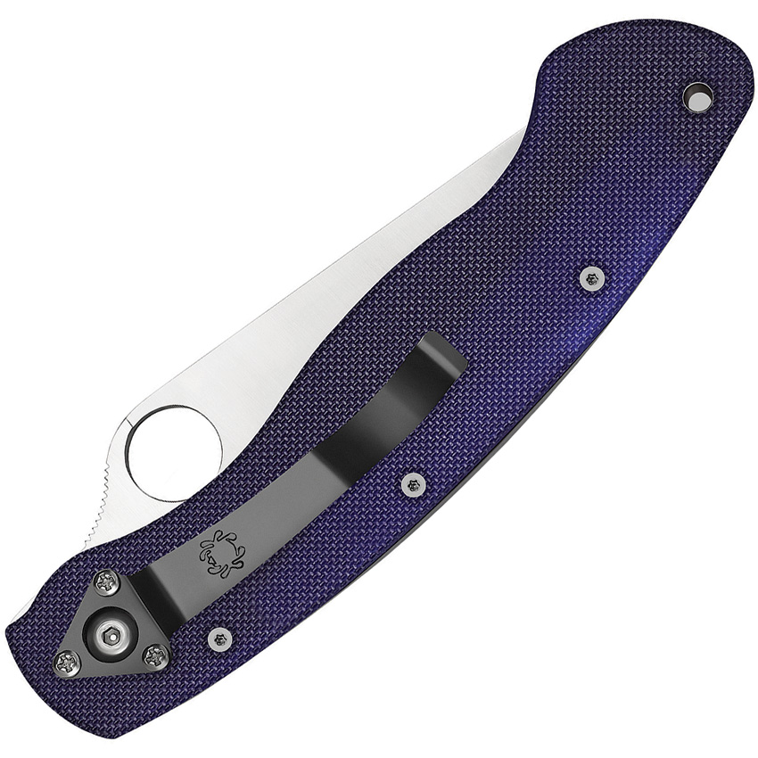 Closed: 5.5″; Blade: 4″ l CPM S110V Stainless l Standard Edge l Satin Finish; Handle: Blue l G10; Other Info: Lanyard Hole l Pocket Clip. Clip point blade with round thumb hole. Boxed.