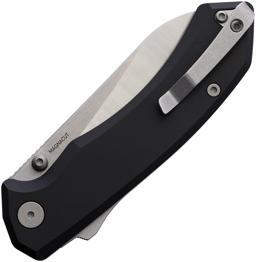 4.5″ (11.43cm) closed. 3.38″ (8.59cm) satin finish MagnaCut steel sheepsfoot blade. Black aluminum handle. Thumb stud. Extended tang. Pocket clip. Boxed.