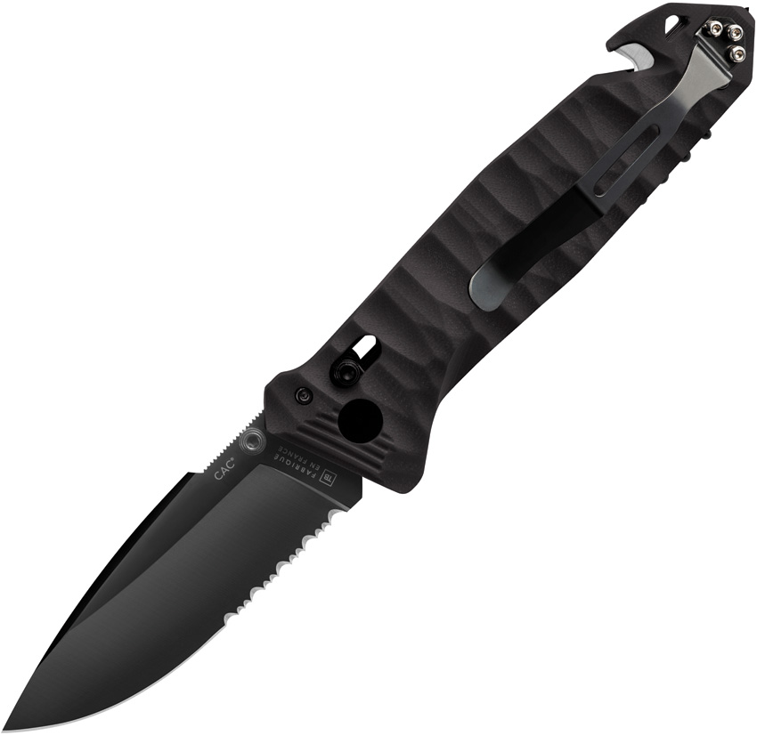 5.75″ (14.61cm) closed. 3.38″ (8.59cm) black finish partially serrated Nitrox steel blade. Black sculpted PA6 handle. Glass breaker. Belt/cord cutter. Lanyard hole. Pocket clip. Thumb stud. Corkscrew. Hardside carrying case.