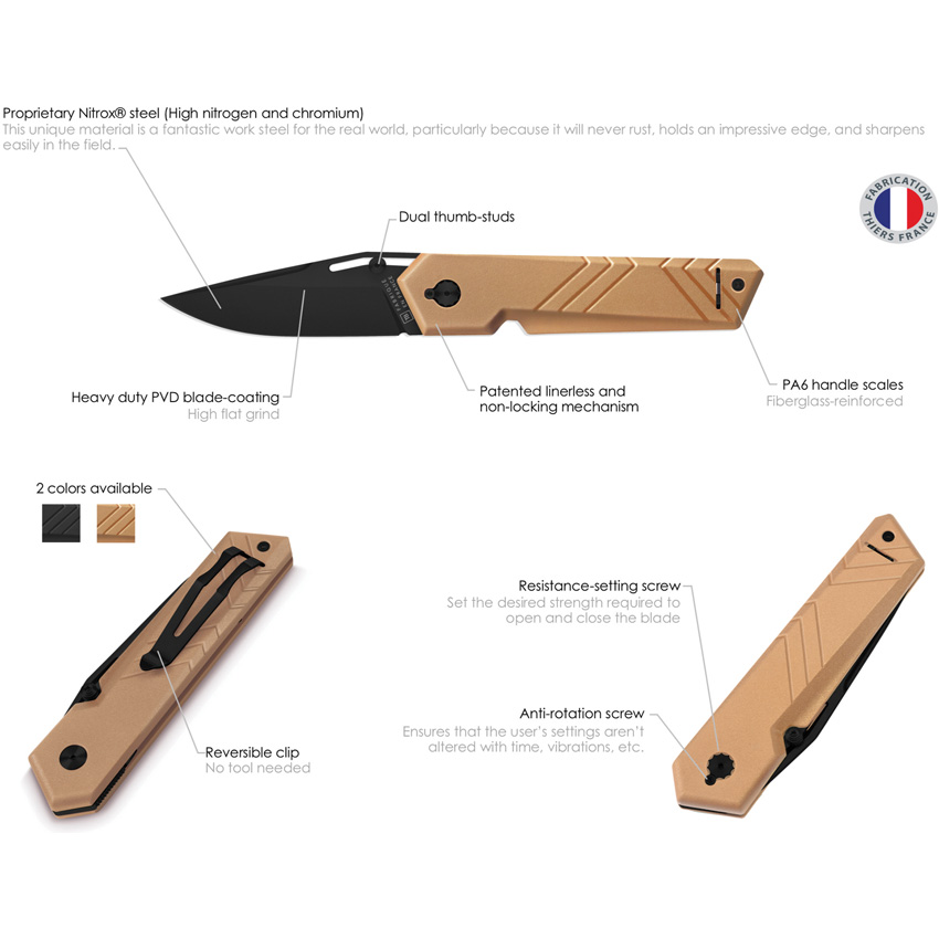 4.25″ (10.8cm) closed. 3″ (7.62cm) black finish Nitrox steel blade. Coyote tan smooth Pa6 handle. Thumb stud. Pocket clip. Comes in plastic tube.
