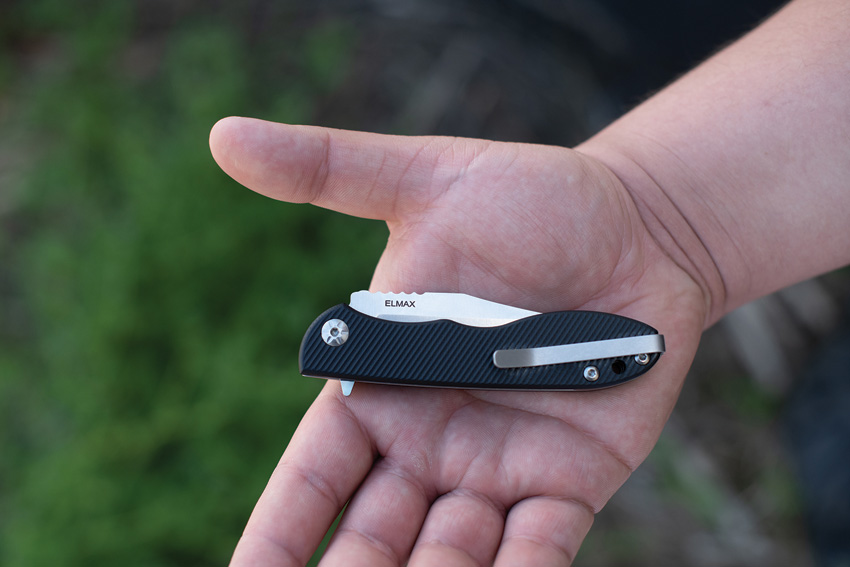 4.38″ (11.13cm) closed. 3.25″ (8.26cm) satin finish Scandi grind Elmax steel drop point blade. Black G10 handle. Extended tang. Lanyard hole. Pocket clip. Boxed.