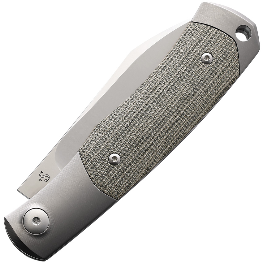 4.13″ (10.49cm) closed. 3.13″ (7.95cm) satin finish Bohler M390 stainless Wharncliffe blade. Green micarta handle. Titanium bolster(s). Lanyard hole. Designed by Sacha Thiel. Rounded steel spring. Brown leather pouch. Boxed.