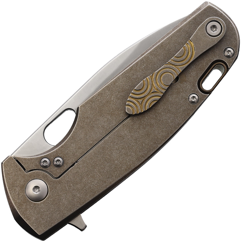 4.25″ (10.8cm) closed. 3.25″ (8.26cm) satin finish CPM-20CV stainless drop point blade. Bronze anodized titanium handle. Extended tang. Pocket clip. Thumb pull. Circles on handle. Serialized limited edition of 150. Bronze anodized single titanium spacer. Boxed.