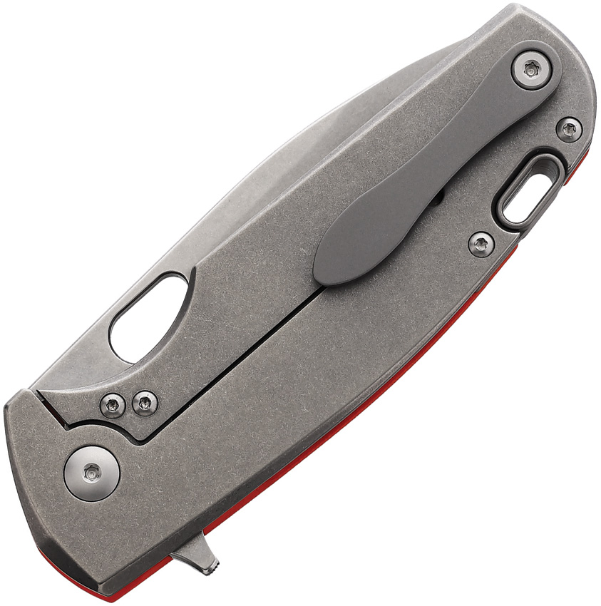 4.25″ (10.8cm) closed. 3.25″ (8.26cm) stonewash finish CPM-20CV stainless blade. Orange G10 handle with stonewash finish titanium back handle. Extended tang. Pocket clip. Thumb pull. Blue anodized single titanium spacer. Boxed.