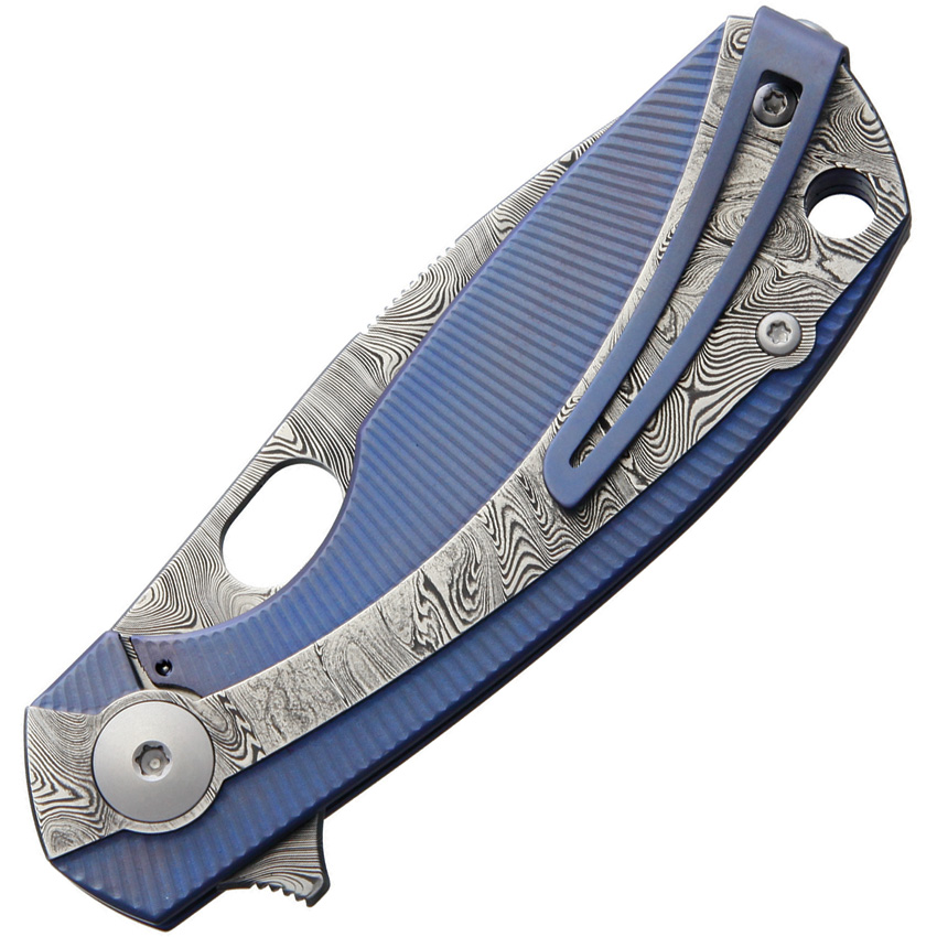3.63″ closed. 2.5″ Damascus steel blade. Sculpted titanium handle with blue anodized titanium onlay. Wooden gift box.