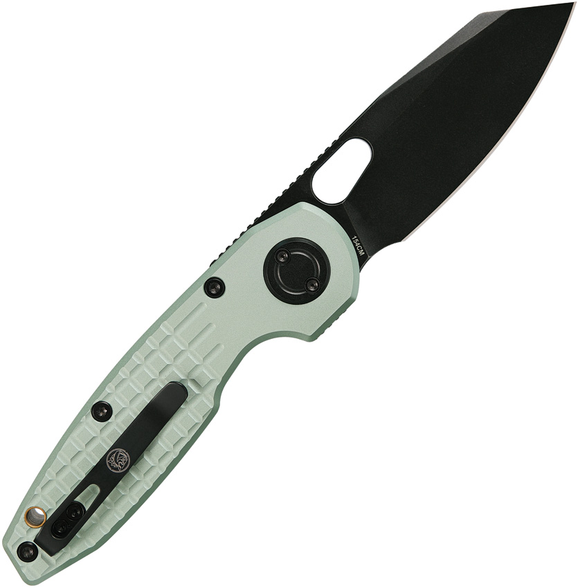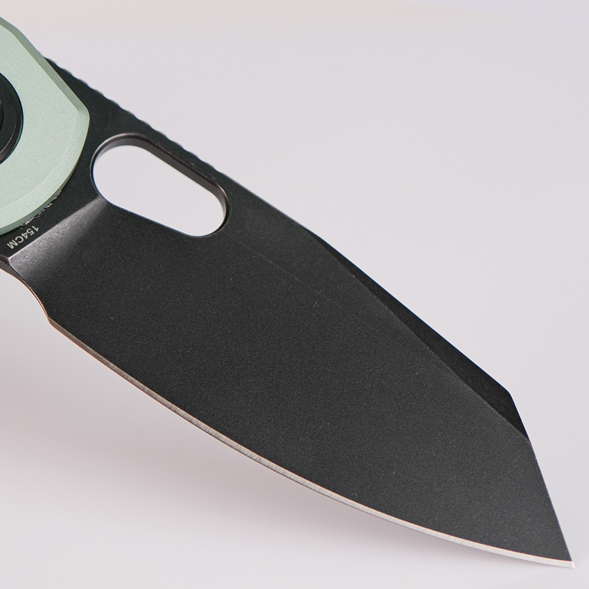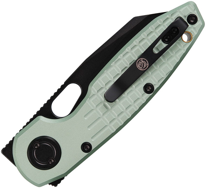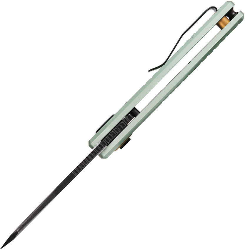 4.5″ (11.43cm) closed. 3.13″ (7.95cm) black stonewash finish 154CM stainless blade. Green sculpted aluminum handle. Thumb pull. Lanyard hole. Pocket clip. Reverse tanto blade. Black nylon zippered storage case. Boxed.