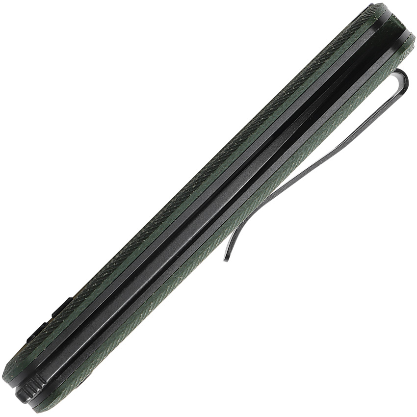 4.13″ (10.49cm) closed. 3″ (7.62cm) black stonewash finish 14C28N Sandvik stainless modified drop point blade. Green canvas micarta handle. Pocket clip. Boxed.